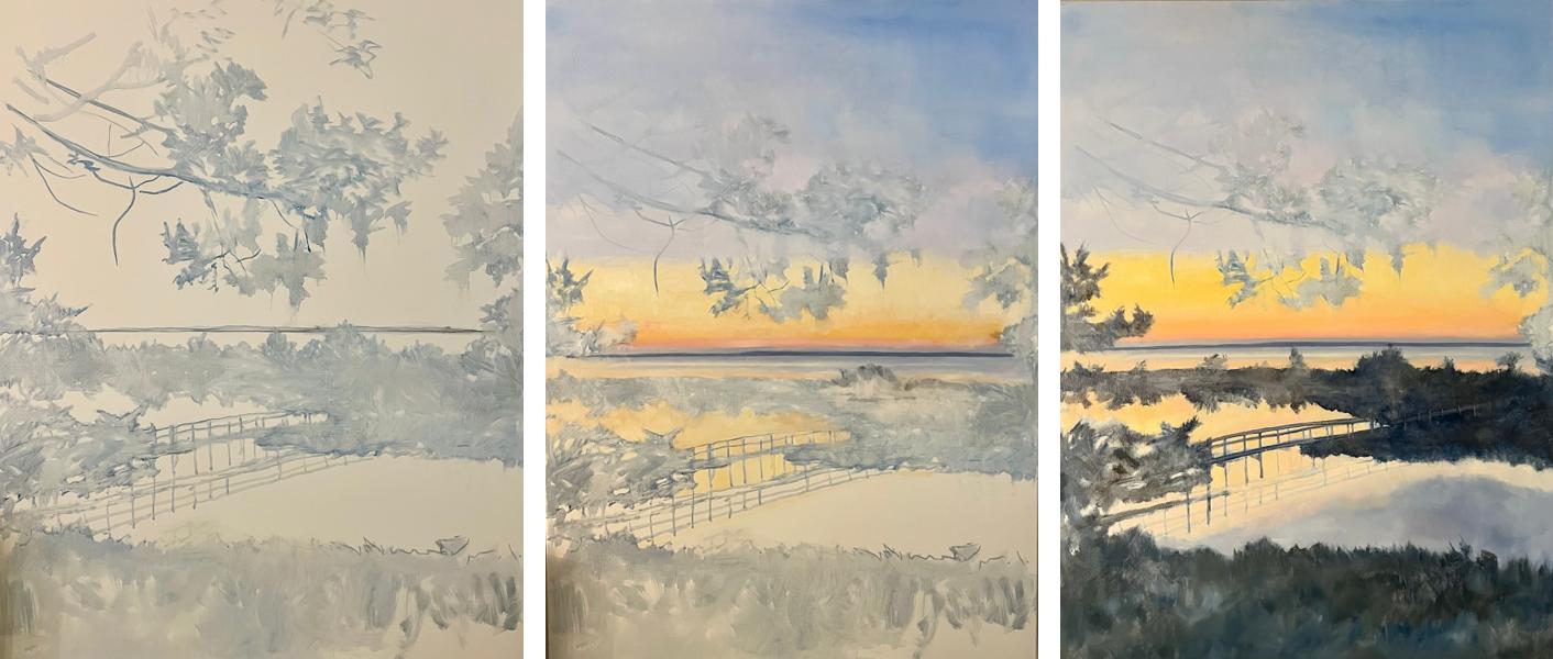 Have you ever noticed how much more vivid the color of the sky is near the time of the full moon? Colors appear brighter, more intense even if it is a bit overcast. This painting is from the time of the October Harvest moon. The sunset was happening in...
